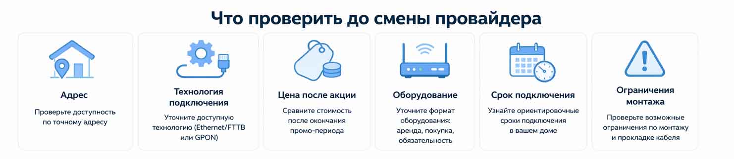 Перед сменой провайдера сначала проверяют адрес, технологию, цену, оборудование и срок подключения